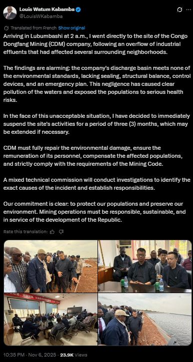 “CDM must fully repair the environmental damage, ensure the remuneration of its staff, compensate the affected populations, and strictly comply with the requirements of the Mining Code,” Watum said, adding that an investigation would be conducted into the incident.