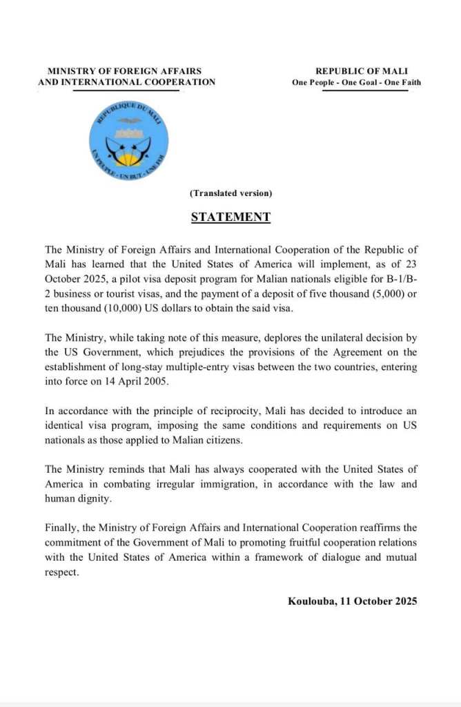 Mali has announced a new visa policy requiring US citizens to post a bond of up to $10,000 before entering the country, in a move that mirrors a previous US measure targeting Malian nationals.